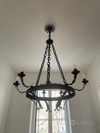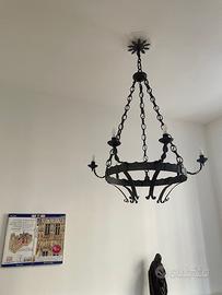 Lampadario a sospensione di stile neogotico in ferro battuto.