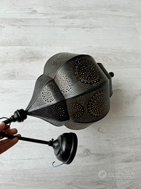 Vendo questo splendido lampadario in stile orientale, realizzato in metallo traforato nero con interno dorato, che crea giochi di luce unici e un’atmosfera calda e accogliente.