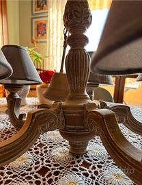 Ha 5 luci con copri lampada integri, struttura in legno, catena per appenderlo.
