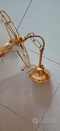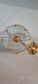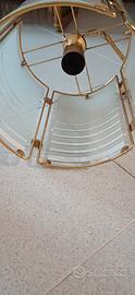 Vendesi elegante lampadario a sospensione vintage, originale degli anni '70/'80. Il pezzo presenta una struttura circolare in metallo dorato/ottone che accoglie pannelli in vetro curvato, decorati con eleganti fasce satinate orizzontali. Stile: Modernariato / Hollywood Regency. Materiali: Struttura in metallo dorato e diffusori in vetro. Condizioni: Il vetro è integro e ben conservato. La struttura metallica presenta alcuni segni del tempo e una naturale patina di ossidazione che ne attesta l'autenticità (come visibile in foto). Con una pulizia specifica per metalli può tornare a splendere o essere mantenuto così per un look vissuto. Dimensioni: altezza 25 cm diametro 23 cm Ottimo per arredare soggiorni, ingressi o camere da letto con un tocco di classe o seconde case