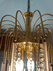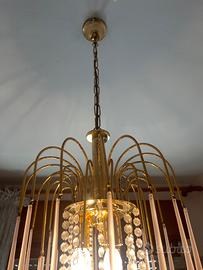 Bellissimo lampadario in ottone con pendenti in vetro satinato e dettagli in cristallo. Diffonde una luce calda e crea un’atmosfera raffinata. Ideale per soggiorno o sala da pranzo Ottime condizioni, funzionante