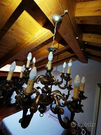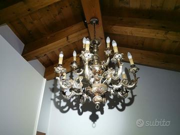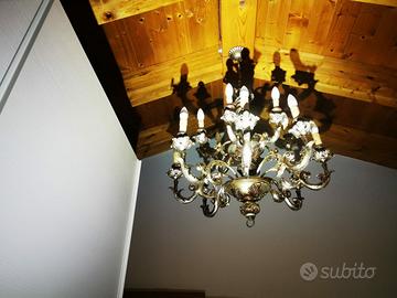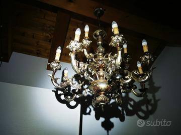 lampadario stile fiorentino in legno, funzionante tolto ieri dalla camera, fatto a mano foglia d'oro ce ne sono due uguali. Diametro 800mm,altezza 810mm, altezza totale compreso di catenella regolabile + sostegno a soffitto 1100mm. lampadario con 14 fiamme, lampadine E 14. 80 euro l'uno, trattabili. NB: RITIRO A MANO DOPO VISIONE, NON SPEDISCO. NO PERDITEMPO