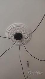 Lampadario con 5 portalampada in metallo bronzo scuro e fili neri. Piccole tassellature rifinite in nero opaco per fissare a piacimento i punti luce. Istallazione direttamente alla corrente 230 v senza bisogno di trasformatore. Lampade escluse.