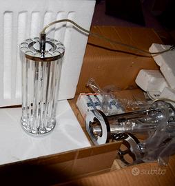 Lampadario pendente con tre lampade con inserti in cristallo, 12 pezzi per ogni lampada. Lunghezza della barra 60 cm, ogni lampada è alta 23 cm con un diametro di 10 cm. Nuovo sempre nella scatola originale compresi tutte le indicazione, lampadine led, viti.