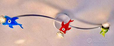 Lampadario Ikea fuori produzione, ideale per le camerette dei bambini. È una plafoniera a binario composta da 3 faretti orientabili con copri lumi a forma di pesciolini colorati (rosso, blu e verde). Il binario ha una lunghezza di circa 70 cm ed è compreso di tre lampadine alogene da 35W (è comunque compatibile con lampadine a LED) Richiede il collegamento diretto all'impianto elettrico del soffitto.