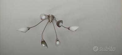 Lampada da parete o soffitto. Corpo in metallo cromato, sei bracci flessibili e snodabili. Lampade ecoalogene, attacco E14, potenza massima 42W. può montare lampade a risparmio energetico o led. Il diffusore in vetro di Murano incamiciato. Euro 250,00