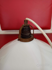 Vendo lampadario di epoca con sistema saliscendi. Il piatto è in vetro bianco, il sistema carrucola e contrappeso sono in ceramica bianca, il portalmpada in Ottone e Bachelite. Il tutto è originale. Solo il cavo elettrico è stato cambiato. Non spedisco. Leggermente trattabile