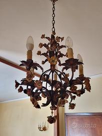 bellissimo lampadario dei primi del 900 in ferro battuto con decori di fiori in vetro