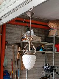 Lampadario primi novecento in ottone in patina , vetro opaline