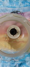 Lampadario a boccia in vetro sabbiato a 1 lampadina (attacco E27), qualche segno di ossidazione superficiale sulle componenti metalliche.
