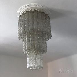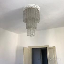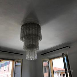 Lampadario in vetro-cristallo composto da tre ordini circolari di bulbi, Altezza complessiva 75 cm , circonferenza 150 - 110 - 80 . Altezza ciascun bulbo cm 30, ogni ordine più piccolo rientra sull'altro di circa 7 cm. Il numero dei bulbi é di 22 - 14 - 8 per ognuno dei tre ordini
