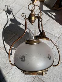 Lampadario in metallo e vetro in stile classico. Adatto per una taverna o una cucina vecchio stile. Monta una lampadina E27 e una circolina che si può spegnere. Va sospeso e ha una catena da 40 cm circa.
