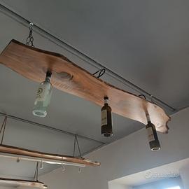 lampadario rustico in legno noce nazionale con bottiglie di vino e lampadine inserite all interno