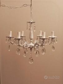 Lampadario anni 60 a 6 luci in bronzo rivisitato in stile shabby chic bianco opaco anticato. Gocce in cristallo originali rimontate con filo in acciaio inox. Molto luminoso. Perfettamente funzionante. Pezzo unico. Dimensioni: diametro cm 50 h. cm 40 + 55 cm di catena e coppino coprifilo. Disponibili appliques abbinabili