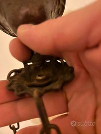 Vendo lampadario realizzato a mano, struttura in ferro con inserto in ceramica piena dipinta a mano, si completa, nella parte superiore, con un'ampolla in vetro opaco contenete un porta lampada lungo, in vetro trasparente, il lampadario è completo di gancio per il soffitto e di tre catenelle in ferro battuto per sorreggerlo.