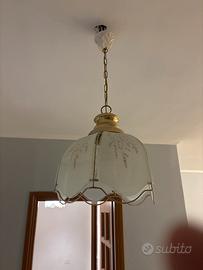 Vendo eleganti coppia di lampadari a sospensione in vetro satinato decorato con motivo floreale e struttura in ottone. Stile classico/vintage, ideale per soggiorno, sala da pranzo o cucina. Produce una luce calda e accogliente.