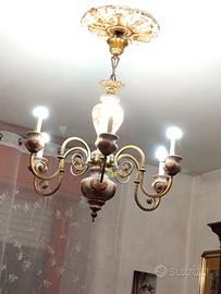 Il lampadario raffigurato è un modello a sei bracci in stilevintageoclassico, probabilmente realizzato inottoneo metallo dorato, con dettagli decorativi in porcellana dipinta. Lo stile è paragonabile ai lampadari fiamminghi o barocchi, popolari tra gli anni '50 e '70, che presentano ricchi ornamenti e linee curve.