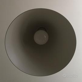 Elegante sospensione a forma conica in metallo verniciato a polveri, in finitura bianco/grigio. Cablata con attacco E27 che consente di montare lampadina LED.