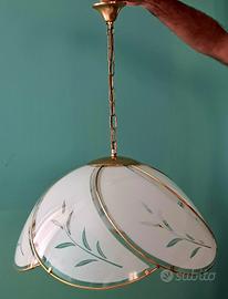 Lampada da soffitto con struttura in acciaio ottonato, catenella, portalampada e cavo elettrico. Particolari le mezze lune concave in vetro satinato con disegni stilizzati