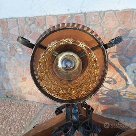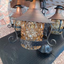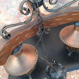 Lampadario rustico a sospensione in ferro battuto e legno massiccio. Paralume in rame con vetro ambrato motivo geometrico. Diametro circa 57 cm Perfettamente funzionante.