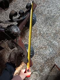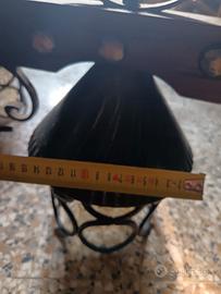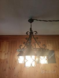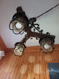 lampadario in stile rustico/medievale, con struttura in ferro battuto, elementi in legno e schermi in vetro lavorato