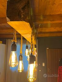 Dai un tocco caldo e unico ai tuoi ambienti con questo lampadario artigianale in stile rustico-industriale. Realizzato a mano con legno massello trattato, questo pezzo unisce la robustezza del legno al fascino delle funi in canapa e delle lampadine Edison a filamento, per un effetto vintage mozzafiato.