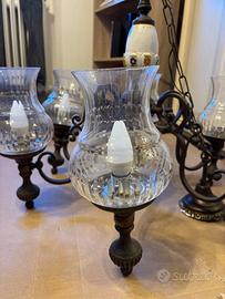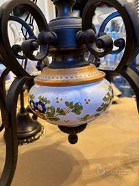 Lampadario stile rustico vintage con struttura in metallo lavorato e ceramica decorata, dotato di 5 luci con paralumi in vetro trasparente