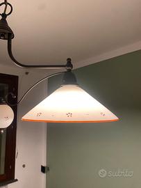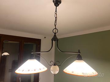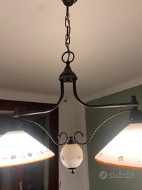 lampadario a sospensione dal design classico che si inserisce perfettamente in ambienti arredati in stile rustico, country-chic, provenzale o in case che prediligono un'atmosfera calda e accogliente. La montatura è realizzata in metallo con finitura scura, tendente al bronzo anticato o al marrone bruciato, che gli conferisce un aspetto tradizionale e robusto. La struttura è composta da un braccio orizzontale ricurvo che sostiene i due diffusori laterali. È sospeso tramite una catena con anelli spessi, collegata a un rosone (coppa) a soffitto dello stesso colore e materiale.