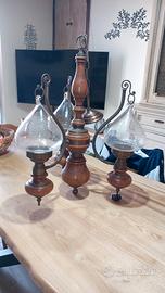 Lampadario rustico in legno, con globi a goccia in vetro lavorato