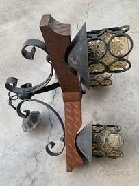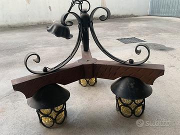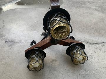 Lamoadario rustico in legno massiccio ferro battuto a mano, coppe in vetro e cupolette in rame, adatto per rustici taverne o patio.