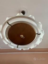 Lampadario degli anni ‘70 con decori. Vetro e legno. Lampadina circolare con diametro 37 cm. Altezza regolabile.