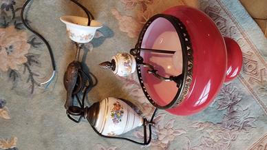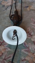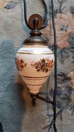 Lampadario in perfette condizioni, in vetro e ceramica\ottone. Lampada in vetro esterno rosso sangue di bue e interno bianco per riflettere la luce. Attacco lampada E27. Copri collegamento elettrico e contrappeso in ceramica con decorazione floreale. Snodi e collegamenti del contrappeso in lega ottone.