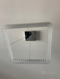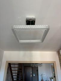 Elegante lampadario a forma quadrata, perfetto per sala da pranzo o salone. La sua struttura in metallo è impreziosita da dettagli in cristallo trasparente che riflettono la luce.
