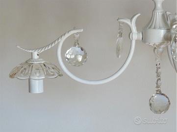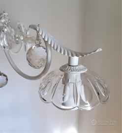 Lampadario a 3 luci in ottone restaurato e rivisitato in stile shabby chic bianco. Gocce, coppini e sfere in cristallo Boemia d'epoca. La lampadina orientata verso il basso lo rende molto luminoso. Perfettamente funzionante. Pezzo unico decorato artigianalmente. Posso spedire. Diametro cm 55 - h. cm 45 + cm 50 catena regolabile e coppino coprifilo.