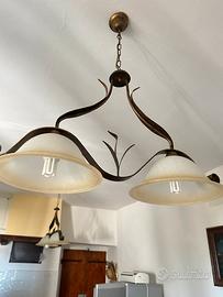2 lampadari come nuovi in ferro battuto e vetro a doppia campana. Prezzo euro 80 cadauno Color bronzo