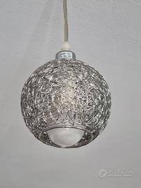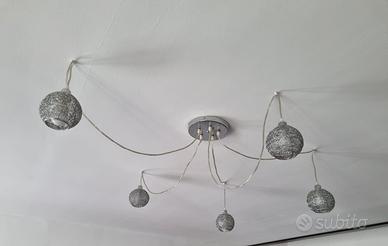 Lampadario sospensione a ragno a 5 sfere in metallo argento con fili adattabili in lunghezza. In stile contemporaneo adatto in soggiorni, sale da pranzo, cucine.