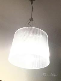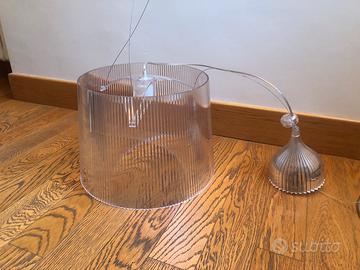 La lampada Kartell Gè è una lampada a sospensione fissata al soffitto con un rosone decorato, che nella forma ricorda quella degli antichi lampadari in vetro di Murano, è composta da un ampio cappello la cui superficie è lavorata ad effetto plissé e ha un diametro di 37 cm. La fune è regolabile in altezza, da un minimo di 45 cm ad un massimo di 230 cm. Qualche segno sulla parte superiore ma comunque in ottimo stato. Già smontata. Se interessati posso inviare altre fotografie e dare ulteriori informazioni