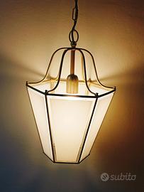 Apparecchio per illuminazione in ottone e vetri bianchi molati. Altezza fino all'anello di aggancio catena 43cm. Completa di catena e cavo(non molto lunghi) e rosone e aggancio a soffitto Diametro (Spigolo-Spigolo) 31 cm. Consegnabile a Firenze zona Castello