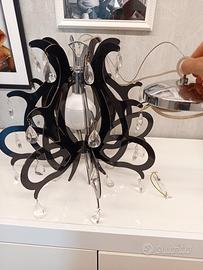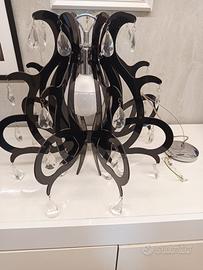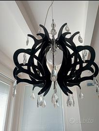 Bellissimo lampadario scenico a sospensione in plexiglass nero con gocce trasparenti (manca una, che non si nota nel complesso appeso). Dimensioni larghezza max 45 cm circa, altezza 53 cm va (senza contare il cavo a cui va appeso).