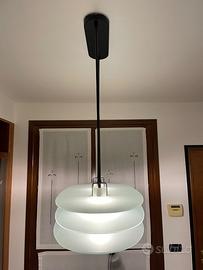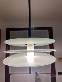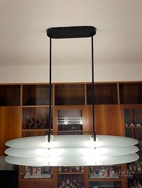 Il lampadario a sospensione modello Vega, prodotto da Quattrifolio, presenta un design lineare caratterizzato da una struttura portante in metallo verniciato nero opaco. La parte illuminante è composta da tre diffusori orizzontali in vetro acidato dalla forma ellittica, sovrapposti tra loro per diffondere la luce in modo indiretto e uniforme. La struttura si fissa al soffitto tramite un rosone oblungo coordinato, dal quale discendono due aste rigide che sostengono il corpo dei diffusori. Il sistema ospita due punti luce protetti da cilindri in vetro bianco satinato, studiati per schermare le lampadine e ottimizzare la rifrazione sui dischi in vetro. L'estetica dell'oggetto rispecchia il design minimalista e geometrico tipico della produzione Quattrifolio, rendendolo adatto a illuminare tavoli da pranzo o ambienti living con uno stile sobrio e funzionale.