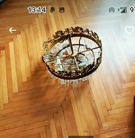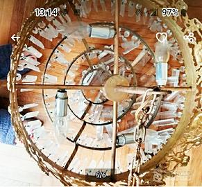 Lampadario Vintage anni 70,bronzo dorato,doratura originale,bordo scolpito personaggi ,n.4 cerchi a scalare,con gocce e prismi in vetro,qualcuno mancante,4 luci, funzionante, misura larghezza cm.47,h. 42, più catena sospensione cm.70.Buono stato funzionante da rivedere,consegna a mano a Torino.