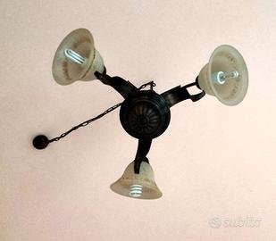 #idearegalo Lampadario sospeso a 3 luci a filetto piccolo, max 40 Watt l'una. Il metallo è verniciato e lavorato martellato simula il fogliame di un fiore. Le lampade sono in vetro con motivi a rilievo verniciate.