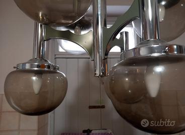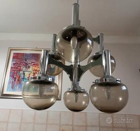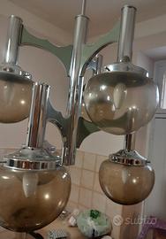 cedo lampadario vintage Space age di Gaetano Sciolari a 6 luci come nuovo, struttura in acciaio e sfere vetro scuro. grandi dimensioni.