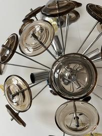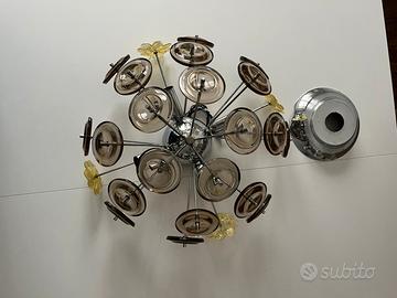 Struttura in merallo lucido, dischi e fiori decorativi in vetro.