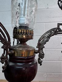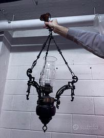 Vendo lampadario in stile lanterna antica, con vetro decorato inciso e struttura in metallo lavorato. Design vintage/elegante ✔ Luce elettrica (non a petrolio) ✔ Vetro inciso decorativo Ritiro a mano in zona.