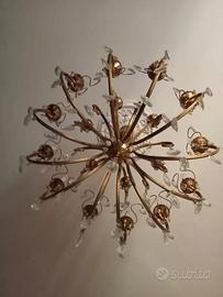 Lampadario stile liberty, 18 luci a sospensione, in bronzo dorato al mercurio (restauro fatto da Mercogliano a Napoli), con pendenti in cristallo e portaluci a candela.