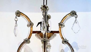 Vendo elegante lampadario a bracci in cristallo con struttura in metallo dorato, completo di pendenti originali. Ritrovato in una casa di famiglia, il lampadario è in perfetto stato di conservazione, senza crepe né danni strutturali. Non è presente certificazione d'origine, ma si tratta di un pezzo di qualità, probabilmente degli anni '60.
