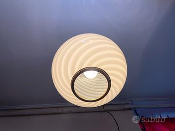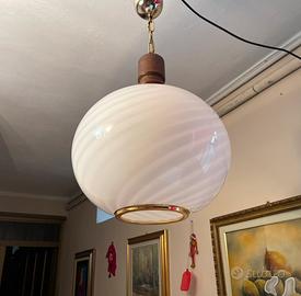 Lampadario in vetro di Murano in condizioni molto buone. Il vetro non è una sfera ma è schiacciata ai poli e ha un diametro di circa 36 cm per un’altezza di 30 cm Nella parte sotto stanze è presente un foro di apertura da 140 mm per inserire lampadina e 27 ed è contornato da un anello dorato. Il vetro è uno spessore di circa 3 mm ed è perfettamente integro. La catena è lunga circa 30 cm . La parte metallica in ottone si presenta in buono stato con leggere ossidazioni. Il legno è ottimo senza difetti. Una volta attaccato al soffitto, esso discende calcolando la parte del polo sud di circa 60 cm. In caso lo si voglia allungare, basterà inserire degli anelli dorati che si trovano dappertutto e allungare il cavo elettrico, ma in genere la lunghezza che presenta è quella giusta. Se vi piace potrete inserirlo in una camera da letto, in una cameretta, in uno studio, in un corridoio o dove si voglia perché è veramente bello. Potrete venire a vederlo di persona ed eventualmente portarlo via se vi piacerà. Mi offro di portarvelo al vostro domicilio fino a un massimo di 30 km con un’aggiunta di 30 € per il disturbo, per il tempo che ci metterò, per la benzina.