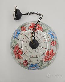 Elegante sospensione in stile Louis Comfort Tiffany / Liberty, con diffusore in vetro decorato floreale nei toni rosso, azzurro e verde.
