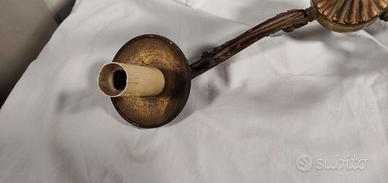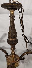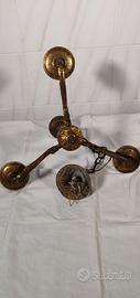 Vendo Lampadario tipo candeliere a 3 braccia vintage, originale anni 1950-1960, il materiale è il classico ottone scurito dal tempo e con ottime lavorazioni e perfettamente funzionante per la parte elettrica, richiede 3 lampadine tipo mignon (tipo E14). Ecco le caratteristiche: diametro circa 47cm larghezza braccia circa 19cm, circonferenza max base porta braccia circa 6cm, circonferenza porta lampade circa 7,5 cm, altezza lampadario senza catena circ 31cm, lunghezza catena con coppetta circa 50cm, diametro max coppetta circa 9cm, altezza coppetta circa 5cm. Il lampadario era installato a soffitto, ma ora sto sostituendo l’arredamento per cui lo vendo.